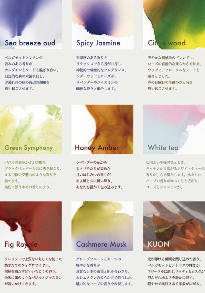 Leiでは9種類の香りをご提案させていただいています。それぞれの香りは、私たちのコレクションに対するイメージを香りで表現しました。ひとつひとつに特徴があり、気分や好みに合わせてお選びいただけます。