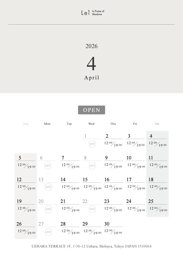 Lei In Praise of Shadows 代々木上原では、オンラインに載せていないアイテムや、限定コレクションなど、店頭ならではのラインナップをご用意しています。